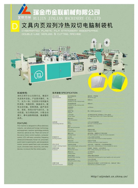 本機應(yīng)用于辦公文具行業(yè),集國外先進技術(shù)設(shè)備。產(chǎn)品技術(shù)集機、電氣、光為一體,主控制部分有伺服電機系統(tǒng)、電腦控制、液晶顯示。配有自動糾編,變頻調(diào)速,超聲波壓紋、滾花、熱切點花氣動打孔、自動控溫,張力調(diào)速送料、計數(shù)自動累計、靜電消除等裝置,確保整機品質(zhì)。